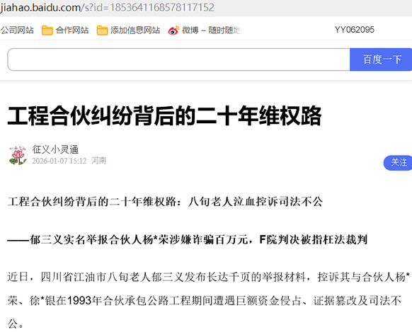 近日,四川省江油市八旬老人郁三义发布长达千页的举报材料,控诉其与合伙人杨*荣、徐*银在1993年合伙承包公路工程期间遭遇巨额资金侵占、证据篡改及司法不公。